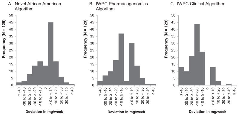 Using a derivation cohort (N=349), we developed the first warfarin dosing algorithm that includes recently discovered polymorphisms in VKORC1 and CYP2C9 associated with warfarin dose requirement in African Americans (AAs). We tested our novel algorithm in an independent cohort of 129 AAs and compared the dose prediction to the International Warfarin Pharmacogenetics Consortium (IWPC) dosing algorithms. Our algorithm explains more of the phenotypic variation (R(2)=0.27) than the IWPC pharmacogenomics (R(2)=0.15) or clinical (R(2)=0.16) algorithms. Among high-dose patients, our algorithm predicted a higher proportion of patients within 20% of stable warfarin dose (45% vs 29% and 2% in the IWPC pharmacogenomics and clinical algorithms, respectively). In contrast to our novel algorithm, a significant inverse correlation between predicted dose and percent West African ancestry was observed for the IWPC pharmacogenomics algorithm among patients requiring ⩾60 mg per week (β=-2.04, P=0.02).