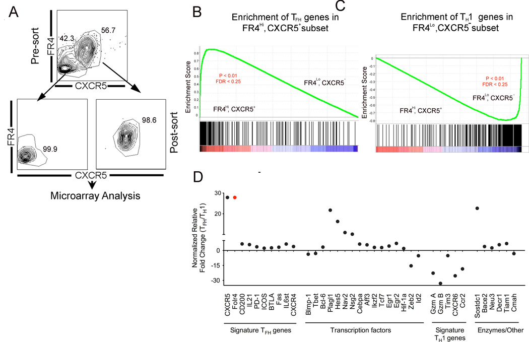 CD4(+) T follicular helper (TFH) cells are central for generation of long-term B-cell immunity. A defining phenotypic attribute of TFH cells is the expression of the chemokine R CXCR5, and TFH cells are typically identified by co-expression of CXCR5 together with other markers such as PD-1, ICOS, and Bcl-6. Herein, we report high-level expression of the nutrient transporter folate R 4 (FR4) on TFH cells in acute viral infection. Distinct from the expression profile of conventional TFH markers, FR4 was highly expressed by naive CD4(+) T cells, was downregulated after activation and subsequently re-expressed on TFH cells. Furthermore, FR4 expression was maintained, albeit at lower levels, on memory TFH cells. Comparative gene expression profiling of FR4(hi) versus FR4(lo) Ag-specific CD4(+) effector T cells revealed a molecular signature consistent with TFH and TH1 subsets, respectively. Interestingly, genes involved in the purine metabolic pathway, including the ecto-enzyme CD73, were enriched in TFH cells compared with TH1 cells, and phenotypic analysis confirmed expression of CD73 on TFH cells. As there is now considerable interest in developing vaccines that would induce optimal TFH cell responses, the identification of two novel cell surface markers should be useful in characterization and identification of TFH cells following vaccination and infection.