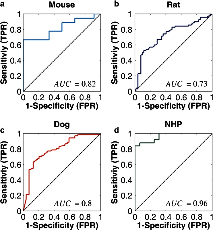 Results: We successfully built ROC curves for the combined dataset and per individual species. Optimal Fanimal thresholds were found to be 67% (mouse), 22% (rat), 58% (dog), 35% (NHP) and 47% (combined dataset). No significant trends were observed when sub-categorizing the outcomes by the BDDCS.