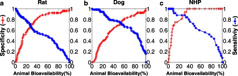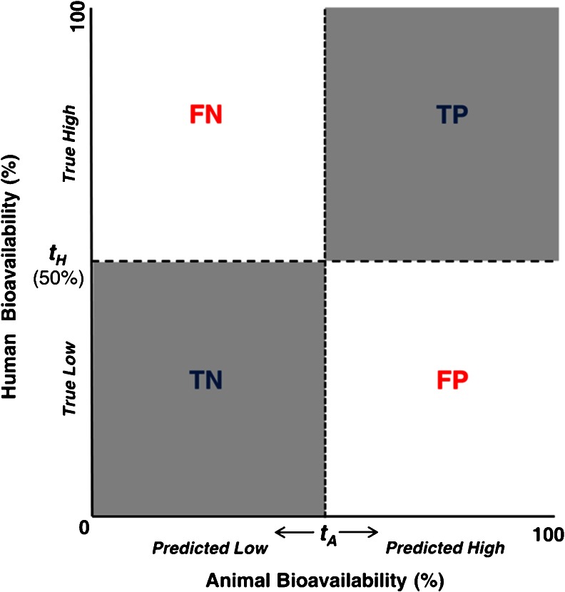 Purpose: To develop and evaluate a tool for the qualitative prediction of human oral bioavailability (Fhuman) from animal oral bioavailability (Fanimal) data employing ROC analysis and to identify the optimal thresholds for such predictions.
