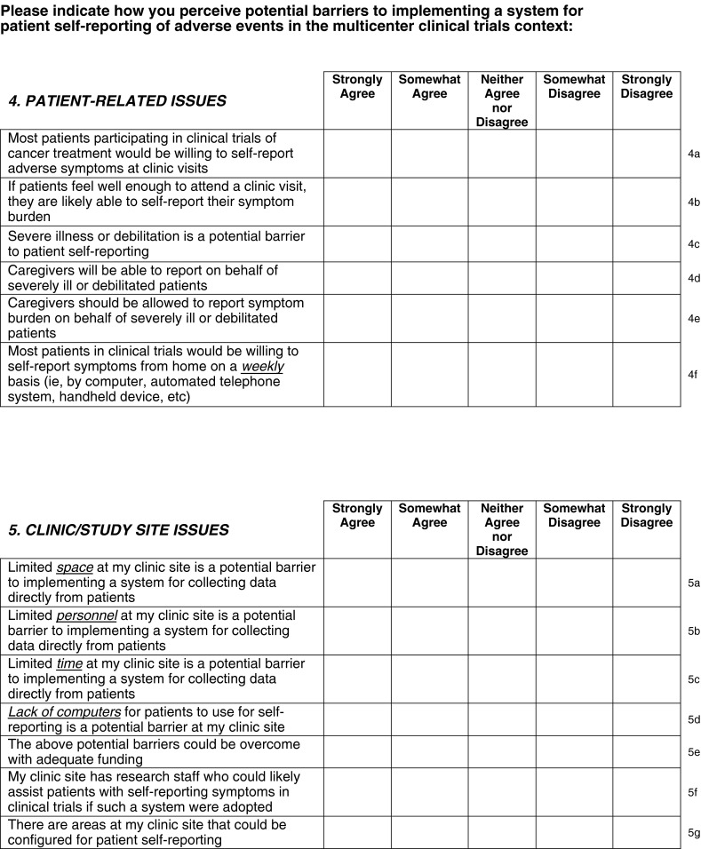 The National Cancer Institute (NCI) is developing a patient-reported version of its Common Terminology Criteria for Adverse Events, called the "PRO-CTCAE." The PRO-CTCAE consists of a library of patient-reported items which can be administered in clinical trials to directly capture the patient experience of adverse events during cancer treatment, as well as a software platform for administering these items via computer or telephone. In order to better understand the impressions of stakeholders involved in cancer clinical research about the potential value of the PRO-CTCAE approach to capturing adverse event information in clinical research, as well as their perspectives about barriers and strategies for implementing the PRO-CTCAE in NCI-sponsored cancer trials, a survey was conducted. A survey including structured and open-ended questions was developed to elicit perceptions about the use of patient-reported outcomes (PROs) for adverse event reporting, and to explore logistical considerations for implementing the PRO-CTCAE in cancer trials. The survey was distributed electronically and by paper to a convenience sample of leadership and committee members in the NCI's cooperative group network, including principal investigators, clinical investigators, research nurses, data managers, patient advocates, and representatives of the NCI and Food and Drug Administration. Between October, 2008 through February, 2009, 727 surveys were collected. Most respondents (93%) agreed that patient reporting of adverse symptoms would be useful for improving understanding of the patient experience with treatment in cancer trials, and 88%, 80%, and 76%, respectively, endorsed that administration of PRO-CTCAE items in clinical trials would improve the completeness, accuracy, and efficiency of symptom data collection. More than three fourths believed that patient reports would be useful for informing treatment dose modifications and towards FDA regulatory evaluation of drugs. Eighty-eight percent felt that patients in clinical trials would be willing to self-report adverse symptoms at clinic visits via computer, and 68% felt patients would self-report weekly from home via the internet or an automated telephone system. Lack of computers and limited space and personnel were seen as potential barriers to in-clinic self-reporting, but these were judged to be surmountable with adequate funding. The PRO-CTCAE items and software are viewed by a majority of survey respondents as a means to improve adverse event data quality and comprehensiveness, enhance clinical decision-making, and foster patient-clinician communication. Research is ongoing to assess the measurement properties and feasibility of implementing this measure in cancer clinical trials.