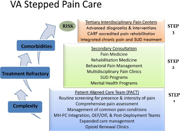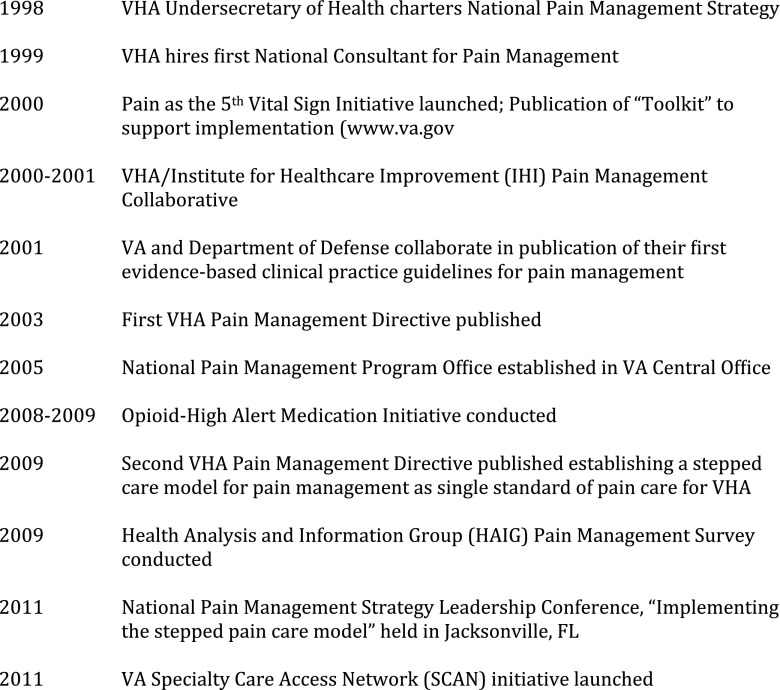 Since its introduction in 1998, the VHA National Pain Management Strategy has introduced and implemented a series of plans for promoting systems improvements in pain care. We present the milestones of VHA efforts in pain management as reflected by the work of the Strategy. This includes the development of the Strategy and its current structure as well as a review of important initiatives such as "pain as the fifth vital sign" and the stepped care model of pain management.