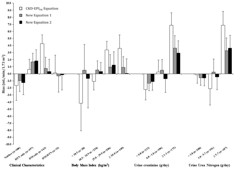 Outcomes: Bias (the median difference between measured GFR [mGFR] and eGFR), precision (the IQR of the difference), accuracy (P30; percentage of participants with eGFR within 30% of mGFR), and the root mean squared error reported as cross-validated estimates along with bootstrapped 95% CIs based on 1,000 replications.
