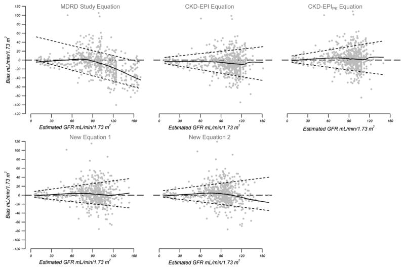 Results: The CKD-EPI (Chronic Kidney Disease Epidemiology Collaboration) creatinine equation performed better than the MDRD (Modification of Diet in Renal Disease) Study equation in terms of greater accuracy at P30 (76.1% [95% CI, 72.7%-79.5%] vs 68.0% [95% CI, 64.3%-71.7%]; P < 0.001) and improved precision (IQR, 22.6 [95% CI, 19.9-25.3] vs 28.6 [95% CI, 25.8-31.5] mL/min/1.73 m(2); P < 0.001). However, both equations overestimated mGFR. Applying modification factors for slope and intercept to the CKD-EPI equation to create a CKD-EPI Pakistan equation (such that eGFRCKD-EPI(PK) = 0.686 × eGFRCKD-EPI(1.059)) in order to eliminate bias improved accuracy (P30, 81.6% [95% CI, 78.4%-84.8%]; P < 0.001) comparably to new estimating equations developed using creatinine level and additional variables.