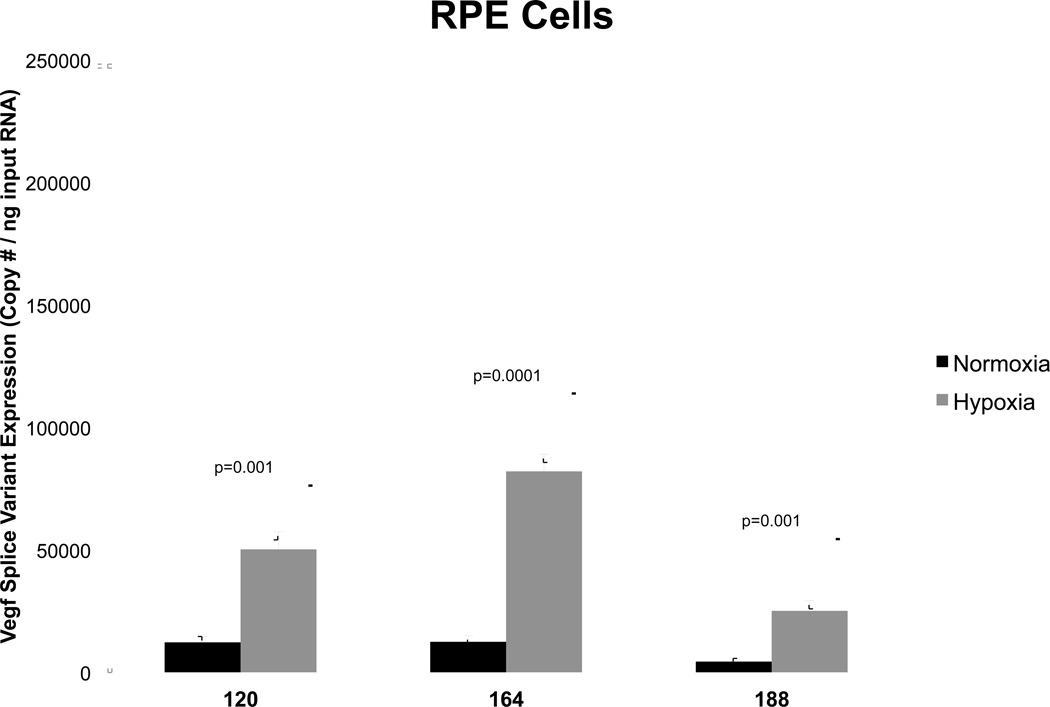 The purpose of this study was to investigate the hypoxia-induced Vegf120, Vegf164 and Vegf188 mRNA expression profiles in rat Müller cells (MC), astrocytes, retinal pigmented epithelial cells (RPE) and retinal microvascular endothelial cells (RMEC) and correlate these findings to VEGF secreted protein. Cultured cells were exposed to normoxia or hypoxia. Total RNA was isolated from cell lysates and Vegf splice variant mRNA copy numbers were assayed by a validated qRT-PCR external calibration curve method. mRNA copy numbers were normalized to input total RNA. Conditioned medium was collected from cells and assayed for total VEGF protein by ELISA. Hypoxia increased total Vegf mRNA and secreted protein in all the retinal cell types, with the highest levels observed in MC and astrocytes ranking second. Total Vegf mRNA levels in hypoxic RPE and RMEC were comparable; however, the greatest hypoxic induction of each Vegf splice variant mRNA was observed in RMEC. RPE and RMEC ranked 3rd and 4th respectively, in terms of secreted total VEGF protein in hypoxia. The Vegf120, Vegf164 and Vegf188 mRNA splice variants were all increased in hypoxic cells compared to normoxic controls. In normoxia, the relative Vegf splice variant mRNA levels ranked from highest to lowest for each cell type were Vegf164 > Vegf120 > Vegf188. Hypoxic induction did not alter this ranking, although it did favor an increased stoichiometry of Vegf164 mRNA over the other two splice variants. MC and astrocytes are likely to be the major sources of total Vegf, Vegf164 splice variant mRNAs, and VEGF protein in retinal hypoxia.