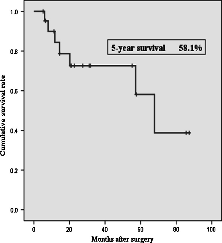 Results: The median duration of surgery was 514 min, and the median blood loss was 439 ml. In surgical procedures, the recipient vessels for the anastomosis of the free jejunum consisted of one artery and one vein (63 %), one artery and two veins (5 %), and two arteries and two veins (31 %). The postoperative morbidity rate was 57.9 % (11 patients), with six cases of partial necrosis of the tracheal margin and no cases of graft necrosis or postoperative in-hospital death. The overall 5-year survival rate after surgery was 58.1 %.