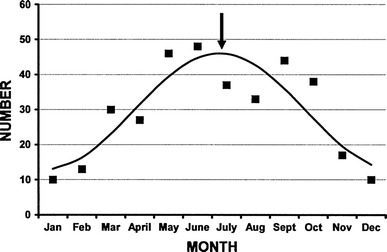 Results: There was a statistically significant increase in the number of fractures during the summer with a peak in early July. When analyzing by month and day of the week, a peak was seen Thursday-Saturday during May-July and middle of the week September-October. Weekdays demonstrated a higher proportion of fractures occurring in the morning and at school. The injuries occurred in the am in 37 and the pm in 241; detailed data were known in 227 with 37 between 0000 and 1159, 51 between 1200 and 1559, and 139 between 1600 and 2359 h. The peak time of injury was 1800 h.