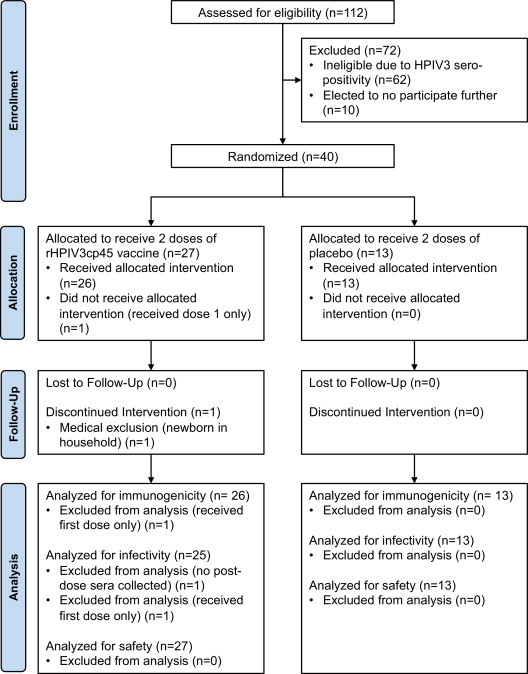 Methods: HPIV3-seronegative children between the ages of 6 and 36 months were randomized 2:1 in a blinded study to receive two doses of 10⁵ TCID₅₀ (50% tissue culture infectious dose) of live-attenuated, recombinant cold-passaged human PIV3 vaccine (rHPIV3cp45) or placebo 6 months apart. Serum antibody levels were assessed prior to and approximately 4-6 weeks after each dose. Vaccine virus infectivity, defined as detection of vaccine-HPIV3 in nasal wash and/or a≥4-fold rise in serum antibody titer, and reactogenicity were assessed on days 3, 7, and 14 following immunization.