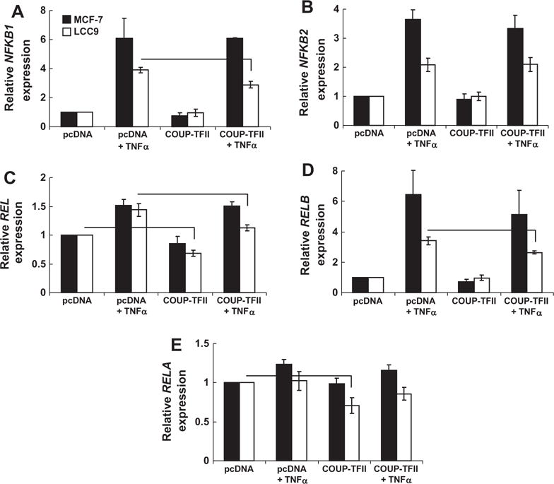 Reduced COUP-TFII expression contributes to endocrine resistance in breast cancer cells. Endocrine-resistant breast cancer cells have higher NFkappa B (NFκB) activity and target gene expression. The goal of this study was to determine if COUP-TFII modulates NFκB activity. Endocrine-resistant LCC9 cells with low endogenous COUP-TFII displayed ∼5-fold higher basal NFκB activity than parental endocrine-sensitive MCF-7 breast cancer cells. Transient transfection of LCC9 cells with COUP-TFII inhibited NFκB activation and reduced NFκB target gene expression. COUP-TFII and NFκB were inversely correlated in breast cancer patient samples. Endogenous COUP-TFII coimmunoprecipitated with NFκB subunits RelB and NFκB1 in MCF-7 cells. COUP-TFII inhibited NFκB-DNA binding in vitro and impaired coactivator induced NFκB transactivation. LCC9 cells were growth-inhibited by an NFκB inhibitor and 4-hydroxytamoxifen compared to MCF-7 cells. Together these data indicate a novel role for COUP-TFII in suppression of NFκB activity and explain, in part, why decreased COUP-TFII expression results in an endocrine-resistant phenotype.