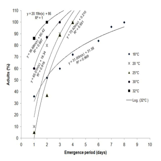 The rice leaf folder, Cnaphalocrocis medinalis Guenée (Lepidoptera: Pyralidae) is a predominant foliage feeder in all the rice ecosystems. The objective of this study was to examine the development of leaf folder at 7 constant temperatures (18, 20, 25, 30, 32, 34, 35° C) and to estimate temperature thresholds and thermal constants for the forecasting models based on heat accumulation units, which could be developed for use in forecasting. The developmental periods of different stages of rice leaf folder were reduced with increases in temperature from 18 to 34° C. The lower threshold temperatures of 11.0, 10.4, 12.8, and 11.1° C, and thermal constants of 69, 270, 106, and 455 degree days, were estimated by linear regression analysis for egg, larva, pupa, and total development, respectively. Based on the thermodynamic non-linear optimSSI model, intrinsic optimum temperatures for the development of egg, larva, and pupa were estimated at 28.9, 25.1 and 23.7° C, respectively. The upper and lower threshold temperatures were estimated as 36.4° C and 11.2° C for total development, indicating that the enzyme was half active and half inactive at these temperatures. These estimated thermal thresholds and degree days could be used to predict the leaf folder activity in the field for their effective management.