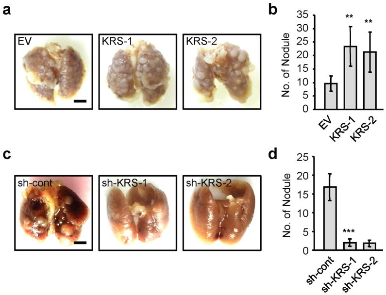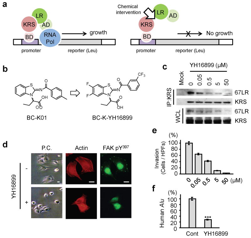 Lysyl-tRNA synthetase (KRS), a protein synthesis enzyme in the cytosol, relocates to the plasma membrane after a laminin signal and stabilizes a 67-kDa laminin receptor (67LR) that is implicated in cancer metastasis; however, its potential as an antimetastatic therapeutic target has not been explored. We found that the small compound BC-K-YH16899, which binds KRS, impinged on the interaction of KRS with 67LR and suppressed metastasis in three different mouse models. The compound inhibited the KRS-67LR interaction in two ways. First, it directly blocked the association between KRS and 67LR. Second, it suppressed the dynamic movement of the N-terminal extension of KRS and reduced membrane localization of KRS. However, it did not affect the catalytic activity of KRS. Our results suggest that specific modulation of a cancer-related KRS-67LR interaction may offer a way to control metastasis while avoiding the toxicities associated with inhibition of the normal functions of KRS.