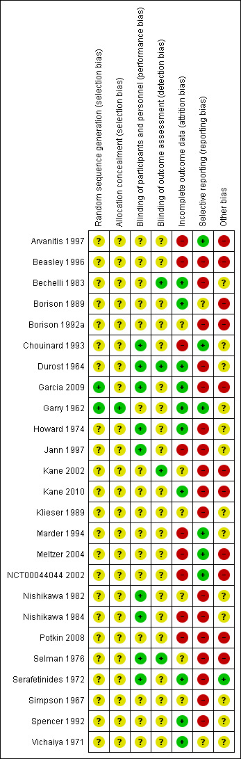 Data collection and analysis: We evaluated data independently and extracted, re-inspected and quality assessed the data. We analysed dichotomous data using risk ratio (RR) and calculated their 95% confidence intervals (CI). For continuous data, we calculated mean differences (MD). We excluded continuous data if loss to follow-up was greater than 50% and inspected data for heterogeneity. We used a fixed-effect model for all analyses. For the 2012 update, we assessed risk of bias of included studies and used the GRADE approach to create a 'Summary of findings' table.