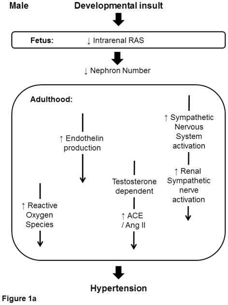 Experimental models of developmental programming provide proof of concept and support Barker's original findings that link birthweight and blood pressure. Many experimental models of developmental insult demonstrate a sex difference with male offspring exhibiting a higher blood pressure in young adulthood relative to their age-matched female counterparts. It is well recognized that men exhibit a higher blood pressure relative to age-matched women prior to menopause. Yet, whether this sex difference is noted in individuals born with low birthweight is not clear. Sex differences in the developmental programming of blood pressure may originate from innate sex-specific differences in expression of the renin angiotensin system that occur in response to adverse influences during early life. Sex differences in the developmental programming of blood pressure may also involve the influence of the hormonal milieu on regulatory systems key to the long-term control of blood pressure such as the renin angiotensin system in adulthood. In addition, the sex difference in blood pressure in offspring exposed to a developmental insult may involve innate sex differences in oxidative status or the endothelin system or may be influenced by age-dependent changes in the developmental programming of cardiovascular risk factors such as adiposity. Therefore, this review will highlight findings from different experimental models to provide the current state of knowledge related to the mechanisms that contribute to the aetiology of sex differences in the developmental programming of blood pressure and hypertension.