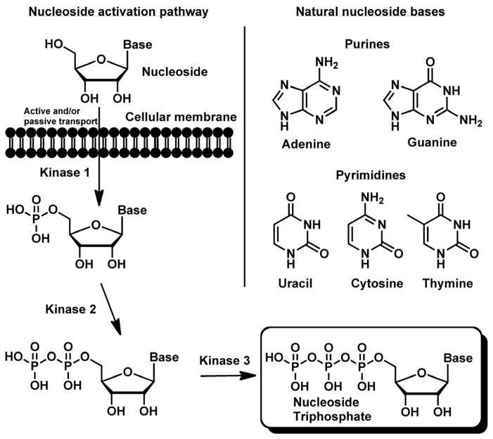 Chutes and Ladders is an exciting up-and-down-again game in which players race to be the first to the top of the board. Along the way, they will find ladders to help them advance, and chutes that will cause them to move backwards. The development of nucleoside analogs for clinical treatment of hepatitis C presents a similar scenario in which taking shortcuts may help quickly advance a program, but there is always a tremendous risk of being sent backwards as one competes for the finish line. In recent years the treatment options for chronic hepatitis C virus (HCV) infection have expand due to the development of a replicon based in vitro evaluation system, allowing for the identification of multiple drugable viral targets along with a concerted and substantial drug discovery effort. Three major drug targets have reached clinical study for chronic HCV infection: the NS3/4A serine protease, the large phosphoprotein NS5A, and the NS5B RNA-dependent RNA polymerase. Recently, two oral HCV protease inhibitors were approved by the FDA and were the first direct acting anti-HCV agents to result from the substantial research in this area. There are currently many new chemical entities from several different target classes that are being evaluated worldwide in clinical trials for their effectiveness at achieving a sustained virologic response (SVR) (Pham et al., 2004; Radkowski et al., 2005). Clearly the goal is to develop therapies leading to a cure that are safe, widely accessible and available, and effective against all HCV genotypes (GT), and all stages of the disease. Nucleoside analogs that target the HCV NS5B polymerase that have reached human clinical trials is the focus of this review as they have demonstrated significant advantages in the clinic with broader activity against the various HCV GT and a higher barrier to the development of resistant viruses when compared to all other classes of HCV inhibitors.