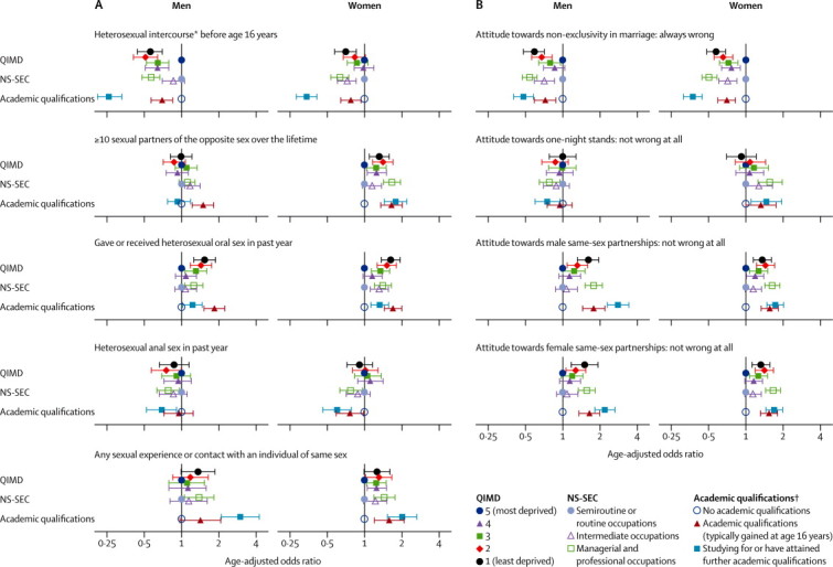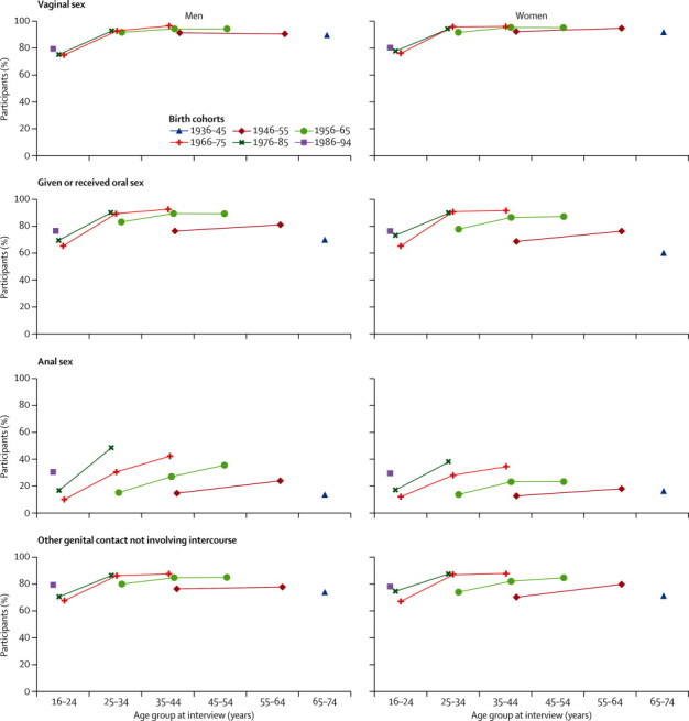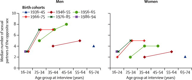 Interpretation: Sexual lifestyles in Britain have changed substantially in the past 60 years, with changes in behaviour seeming greater in women than men. The continuation of sexual activity into later life--albeit reduced in range and frequency--emphasises that attention to sexual health and wellbeing is needed throughout the life course.