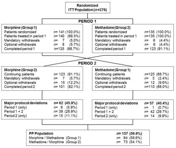 Design: Prospective, multiple-dose, open label, randomized, non-inferiority, cross-over study over two 11-week periods. Methadone treatment was switched to SROM with flexible dosing and vice versa according to period and sequence of treatment.