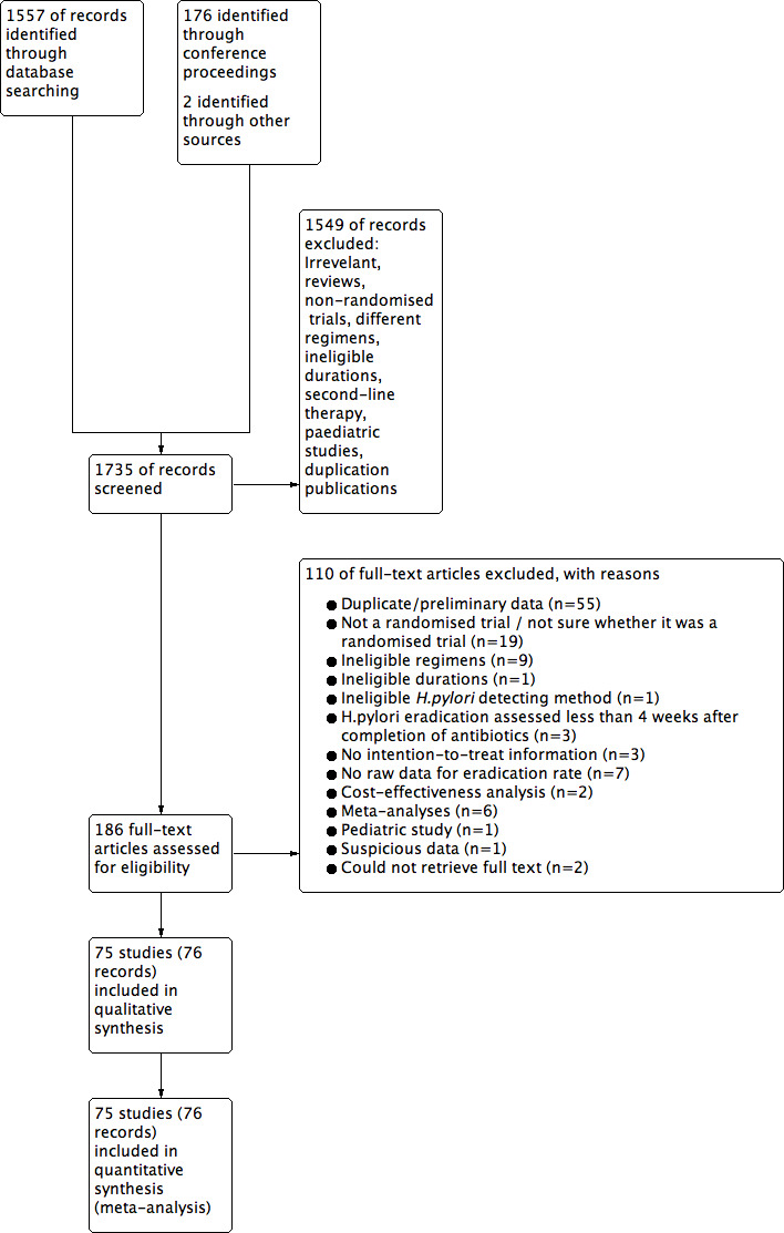 Main results: In total, 75 studies met the inclusion criteria. Eight types of regimens were reported with at least two comparative eligible durations. They included: PPI + two antibiotics triple therapy (n = 59), PPI bismuth-based quadruple therapy (n = 6), PPI + three antibiotics quadruple therapy (n = 1), PPI dual therapy (n = 2), histamine H2-receptor antagonist (H₂RA) bismuth quadruple therapy (n = 3), H₂RA bismuth-based triple therapy (n = 2), H₂RA + two antibiotics triple therapy (n = 3), and bismuth + two antibiotics triple therapy (n = 2). Some studies provided data for more than one regimen or more than two durations.For the PPI triple therapy, 59 studies with five regimens were reported: PPI + clarithromycin + amoxicillin (PCA); PPI + clarithromycin + a nitroimidazole (PCN); PPI + amoxicillin + nitroimidazole (PAN); PPI + amoxicillin + a quinolone (PAQ); and PPI + amoxicillin + a nitrofuran (PANi). Regardless of type and dose of antibiotics, increased duration of PPI triple therapy from 7 to 14 days significantly increased the H. pylori eradication rate (45 studies, 72.9% versus 81.9%), the RR for H. pylori persistence was 0.66 (95% CI 0.60 to 0.74), NNT was 11 (95% CI 9 to 14). Significant effects were seen in the subgroup of PCA (34 studies, RR 0.65, 95% CI 0.57 to 0.75; NNT 12, 95% CI 9 to 16); PAN (10 studies, RR 0.67, 95% CI 0.52 to 0.86; NNT = 11, 95% CI 8 to 25); and in PAQ (2 studies, RR 0.37, 95% CI 0.16 to 0.83; NNT 3, 95% CI 2 to 10); but not in PCN triple therapy (4 studies, RR 0.87, 95% CI 0.71 to 1.07). Significantly increased eradication rates were also seen for PPI triple therapy with 10 versus 7 days (24 studies, 79.9% versus 75.7%; RR 0.80, 95% CI 0.72 to 0.89; NNT 21, 95% CI 15 to 38) and 14 versus 10 days (12 studies, 84.4% versus 78.5%; RR 0.72, 95% CI 0.58 to 0.90; NNT 17, 95% CI 11 to 46); especially in the subgroup of PAC for 10 versus 7 days (17 studies, RR 0.80, 95% CI 0.70 to 0.91) and for 14 versus 10 days (10 studies, RR 0.69, 95% CI 0.52 to 0.91). A trend towards increased H. pylori eradication rates was seen with increased duration of PCN for 10 versus 7 days, and of PAN for 10 versus 7 days and 14 versus 10 days, though this was not statistical significant. The proportion of patients with adverse events, defined by authors, was marginally significantly increased only between 7 days and 14 days (15.5% versus 19.4%; RR 1.21, 95% CI 1.06 to 1.37; NNTH 31, 95% CI 18 to 104) but not for other duration comparisons. The proportion of patients discontinuing treatment due to adverse events was not significantly different between treatment durations.Only limited data were reported for different durations of regimens other than PPI triple therapy. No significant difference of the eradication rate was seen for all regimens according to different durations except for H₂RA bismuth quadruple therapy, where a significantly higher eradication rate was seen for 14 days versus 7 days, however only one study reported outcome data.