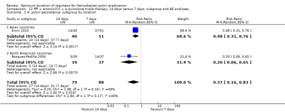 Data collection and analysis: Study eligibility and data extraction were performed by two independent review authors. Data analyses were performed within each type of intervention, for both primary and secondary outcomes. The relative risk (RR) and number needed to treat (NNT)/number needed to harm (NNTH) according to duration of therapy were calculated using the outcomes of H. pylori persistence and adverse events. A random-effects model was used. Subgroup analyses and sensitivity analyses were planned a priori.
