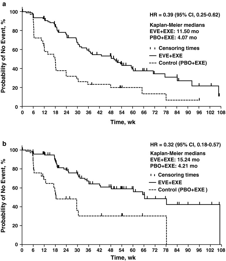 The present exploratory analysis examined the efficacy, safety, and quality-of-life effects of everolimus (EVE) + exemestane (EXE) in the subgroup of patients in BOLERO-2 whose last treatment before study entry was in the (neo)adjuvant setting. In BOLERO-2, patients with hormone-receptor-positive (HR(+)), human epidermal growth factor receptor-2-negative (HER2(-)) advanced breast cancer recurring/progressing after a nonsteroidal aromatase inhibitor (NSAI) were randomly assigned (2:1) to receive EVE (10 mg/day) + EXE (25 mg/day) or placebo (PBO) + EXE. The primary endpoint was progression-free survival (PFS) by local assessment. Overall, 137 patients received first-line EVE + EXE (n = 100) or PBO + EXE (n = 37). Median PFS by local investigator assessment nearly tripled to 11.5 months with EVE + EXE from 4.1 months with PBO + EXE (hazard ratio = 0.39; 95 % CI 0.25-0.62), while maintaining quality of life. This was confirmed by central assessment (15.2 vs 4.2 months; hazard ratio = 0.32; 95 % CI 0.18-0.57). The marked PFS improvement in patients receiving EVE + EXE as first-line therapy for disease recurrence during or after (neo)adjuvant NSAI therapy supports the efficacy of this combination in the first-line setting. Furthermore, the results highlight the potential benefit of early introduction of EVE + EXE in the management of HR(+), HER2(-) advanced breast cancer in postmenopausal patients.