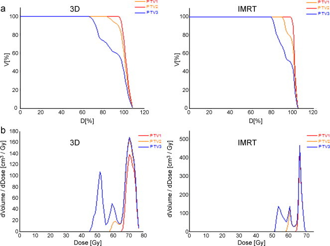 Conclusion: Compared with 3D-CRT, the application of IMRT improves the dose distribution within the concave target volumes and reduces dose to the OAR structures without compromising target coverage.