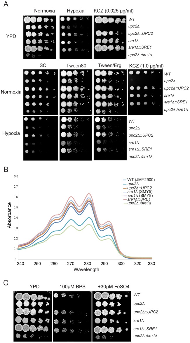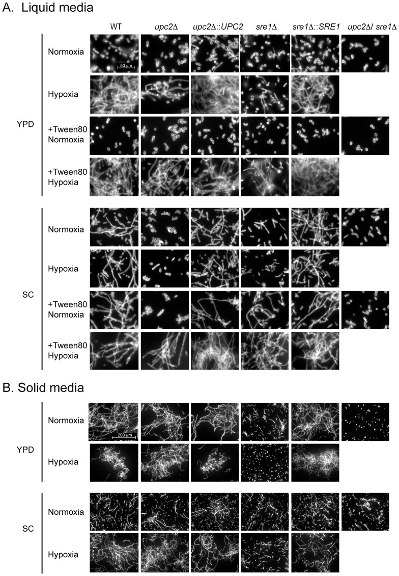 In most eukaryotes, including the majority of fungi, expression of sterol biosynthesis genes is regulated by Sterol-Regulatory Element Binding Proteins (SREBPs), which are basic helix-loop-helix transcription activators. However, in yeasts such as Saccharomyces cerevisiae and Candida albicans sterol synthesis is instead regulated by Upc2, an unrelated transcription factor with a Gal4-type zinc finger. The SREBPs in S. cerevisiae (Hms1) and C. albicans (Cph2) have lost a domain, are not major regulators of sterol synthesis, and instead regulate filamentous growth. We report here that rewiring of the sterol regulon, with Upc2 taking over from SREBP, likely occurred in the common ancestor of all Saccharomycotina. Yarrowia lipolytica, a deep-branching species, is the only genome known to contain intact and full-length orthologs of both SREBP (Sre1) and Upc2. Deleting YlUPC2, but not YlSRE1, confers susceptibility to azole drugs. Sterol levels are significantly reduced in the YlUPC2 deletion. RNA-seq analysis shows that hypoxic regulation of sterol synthesis genes in Y. lipolytica is predominantly mediated by Upc2. However, YlSre1 still retains a role in hypoxic regulation; growth of Y. lipolytica in hypoxic conditions is reduced in a Ylupc2 deletion and is abolished in a Ylsre1/Ylupc2 double deletion, and YlSre1 regulates sterol gene expression during hypoxia adaptation. We show that YlSRE1, and to a lesser extent YlUPC2, are required for switching from yeast to filamentous growth in hypoxia. Sre1 appears to have an ancestral role in the regulation of filamentation, which became decoupled from its role in sterol gene regulation by the arrival of Upc2 in the Saccharomycotina.