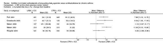 Authors' conclusions: In adults with asthma that is inadequately controlled by predominantly low-dose ICS with significant bronchodilator reversibility, the addition of LABA to ICS is modestly superior to the addition of LTRA in reducing oral corticosteroid-treated exacerbations, with an absolute reduction of two percentage points. Differences favouring LABA over LTRA as adjunct therapy were observed in lung function and, to a lesser extend, in rescue medication use, symptoms and quality of life. The lower overall withdrawal rate and the higher proportion of participants satisfied with their therapy indirectly favour the combination of LABA + ICS over LTRA + ICS. Evidence showed a slightly increased risk of SAE with LABA compared with LTRA, with an absolute increase of one percentage point. Our findings modestly support the use of a single inhaler for the delivery of both LABA and low- or medium-dose ICS. Because of the paucity of paediatric trials, we are unable to draw firm conclusions about the best adjunct therapy in children.