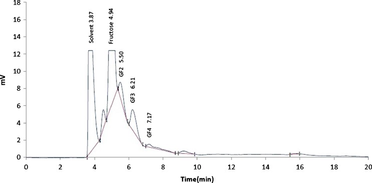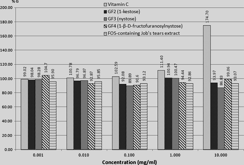 Fructooligosaccharide (FOS), a prebiotic was extracted from the grain of Coix lachryma-jobi Linn. (Job's tears) by hot water extraction at 60 °C for 1 h. The resulting dried powder extract was assayed for FOS content of 1-kestose (GF2), nystose (GF3) and 1-β-D-fructofuranosylnystose (GF4) using HPLC equipped with RI detector. Total FOS content of the extract was 24.98 ± 7.48% (g/100 g crude extract). The biological activity including antioxidant and cytotoxicity of the FOS-containing extract was determined. The antioxidant activity by DPPH free radical scavenging of FOS-containing extract was comparable to vitamin C (0.97 fold of vitamin C) with a slight lipid peroxidation inhibition activity. The extract exhibited no cytotoxic effect on normal human skin fibroblast. These results have confirmed not only the source of FOS from Job's tears extract but also its potential application as antioxidant in food or cosmetic products.