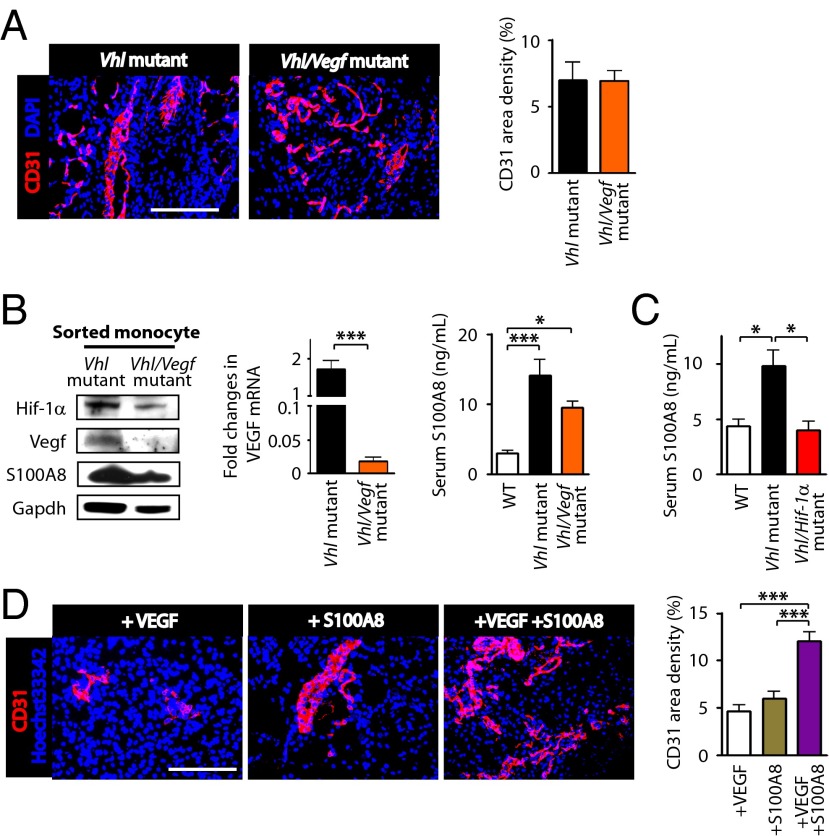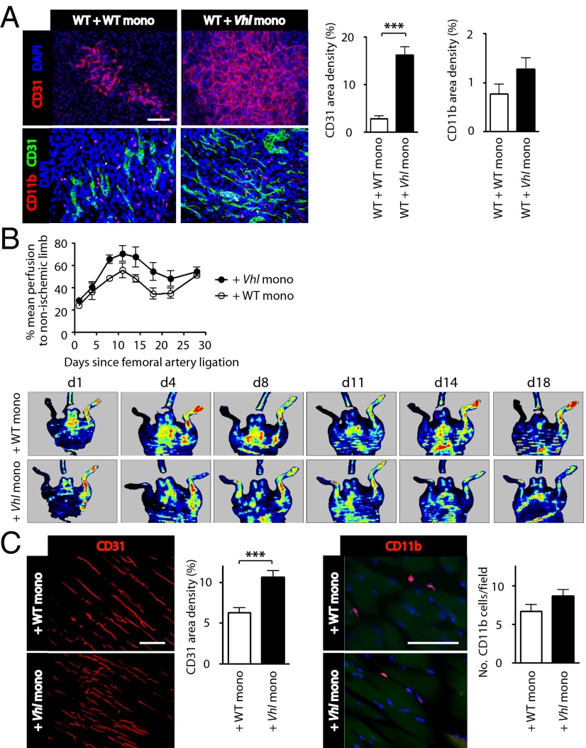 Emerging evidence indicates that myeloid cells are essential for promoting new blood vessel formation by secreting various angiogenic factors. Given that hypoxia-inducible factor (HIF) is a critical regulator for angiogenesis, we questioned whether HIF in myeloid cells also plays a role in promoting angiogenesis. To address this question, we generated a unique strain of myeloid-specific knockout mice targeting HIF pathways using human S100A8 as a myeloid-specific promoter. We observed that mutant mice where HIF-1 is transcriptionally activated in myeloid cells (by deletion of the von Hippel-Lindau gene) resulted in erythema, enhanced neovascularization in matrigel plugs, and increased production of vascular endothelial growth factor (VEGF) in the bone marrow, all of which were completely abrogated by either genetic or pharmacological inactivation of HIF-1. We further found that monocytes were the major effector producing VEGF and S100A8 proteins driving neovascularization in matrigel. Moreover, by using a mouse model of hindlimb ischemia we observed significantly improved blood flow in mice intramuscularly injected with HIF-1-activated monocytes. This study therefore demonstrates that HIF-1 activation in myeloid cells promotes angiogenesis through VEGF and S100A8 and that this may become an attractive therapeutic strategy to treat diseases with vascular defects.