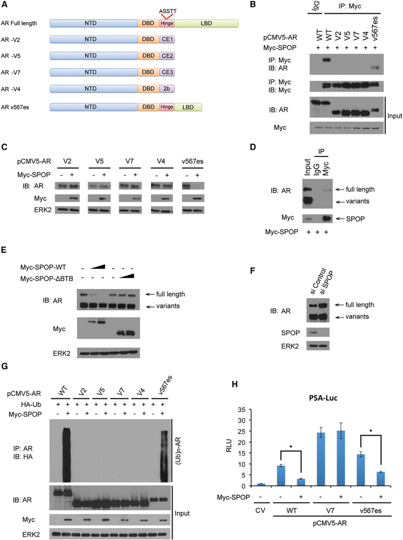 The SPOP E3 ubiquitin ligase gene is frequently mutated in human prostate cancers. Here, we demonstrate that SPOP recognizes a Ser/Thr-rich degron in the hinge domain of androgen receptor (AR) and induces degradation of full-length AR and inhibition of AR-mediated gene transcription and prostate cancer cell growth. AR splicing variants, most of which lack the hinge domain, escape SPOP-mediated degradation. Prostate-cancer-associated mutants of SPOP cannot bind to and promote AR destruction. Furthermore, androgens antagonize SPOP-mediated degradation of AR, whereas antiandrogens promote this process. This study identifies AR as a bona fide substrate of SPOP and elucidates a role of SPOP mutations in prostate cancer, thus implying the importance of this pathway in resistance to antiandrogen therapy of prostate cancer.