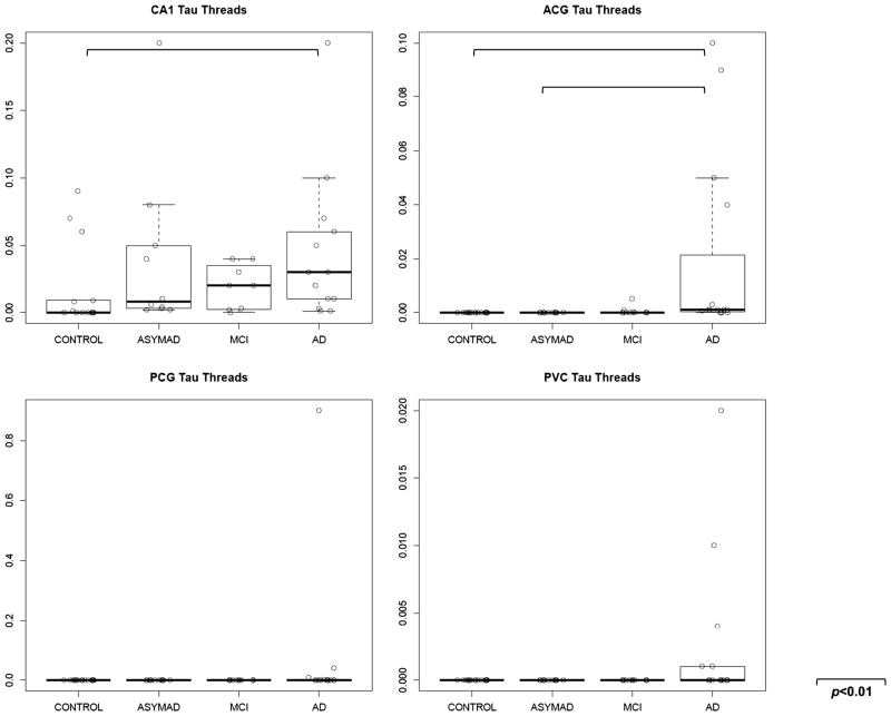 Older adults with intact cognition before death and substantial Alzheimer disease (AD) lesions at autopsy have been termed "asymptomatic AD subjects" (ASYMAD). We previously reported hypertrophy of neuronal cell bodies, nuclei, and nucleoli in the CA1 of the hippocampus (CA1), anterior cingulate gyrus, posterior cingulate gyrus, and primary visual cortex of ASYMAD versus age-matched Control and mild cognitive impairment (MCI) subjects. However, it was unclear whether the neuronal hypertrophy could be attributed to differences in the severity of AD pathology. Here, we performed quantitative analyses of the severity of β-amyloid (Aβ) and phosphorylated tau (tau) loads in the brains of ASYMAD, Control, MCI, and AD subjects (n = 15 per group) from the Baltimore Longitudinal Study of Aging. Tissue sections from CA1, anterior cingulate gyrus, posterior cingulate gyrus, and primary visual cortex were immunostained for Aβ and tau; the respective loads were assessed using unbiased stereology by measuring the fractional areas of immunoreactivity for each protein in each region. The ASYMAD and MCI groups did not differ in Aβ and tau loads. These data confirm that ASYMAD and MCI subjects have comparable loads of insoluble Aβ and tau in regions vulnerable to AD pathology despite divergent cognitive outcomes. These findings imply that cognitive impairment in AD may be caused or modulated by factors other than insoluble forms of Aβ and tau.