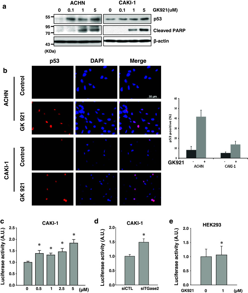 Results: GK921 showed cytotoxicity to RCC (average GI50 in eight RCC cell lines: 0.905 μM). A single treatment with GK921 almost completely reduced tumor growth by stabilizing p53 in the ACHN and CAKI-1 preclinical xenograft tumor models.