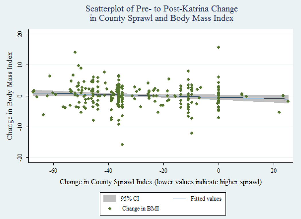 Results: Respondents from 8 New Orleans-area counties were dispersed to 76 counties post-Katrina. Sprawl increased by an average of 1.5 standard deviations (30 points) on the county sprawl index. Each one point increase in sprawl was associated with approximately .05kg/m(2) higher BMI in unadjusted models (95%CI: .01-.08), and the relationship was not attenuated after covariate adjustment.