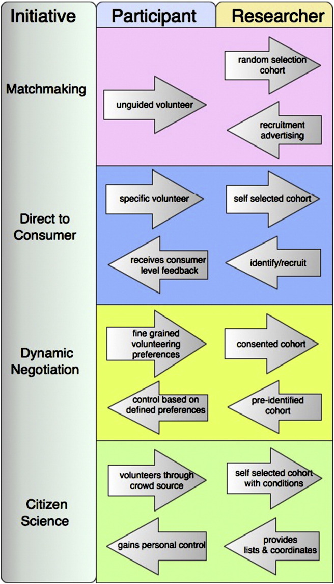 Clinical genomic research faces increasing challenges in establishing participant privacy and consent processes that facilitate meaningful choice and communication capacity for longitudinal and secondary research uses. There are an evolving range of participant-centric initiatives that combine web-based informatics tools with new models of engagement and research collaboration. These emerging initiatives may become valuable approaches to support large-scale and longitudinal research studies. We highlight and discuss four types of emerging initiatives for engaging and sustaining participation in research.
