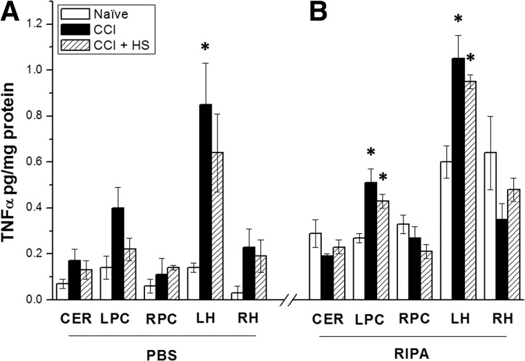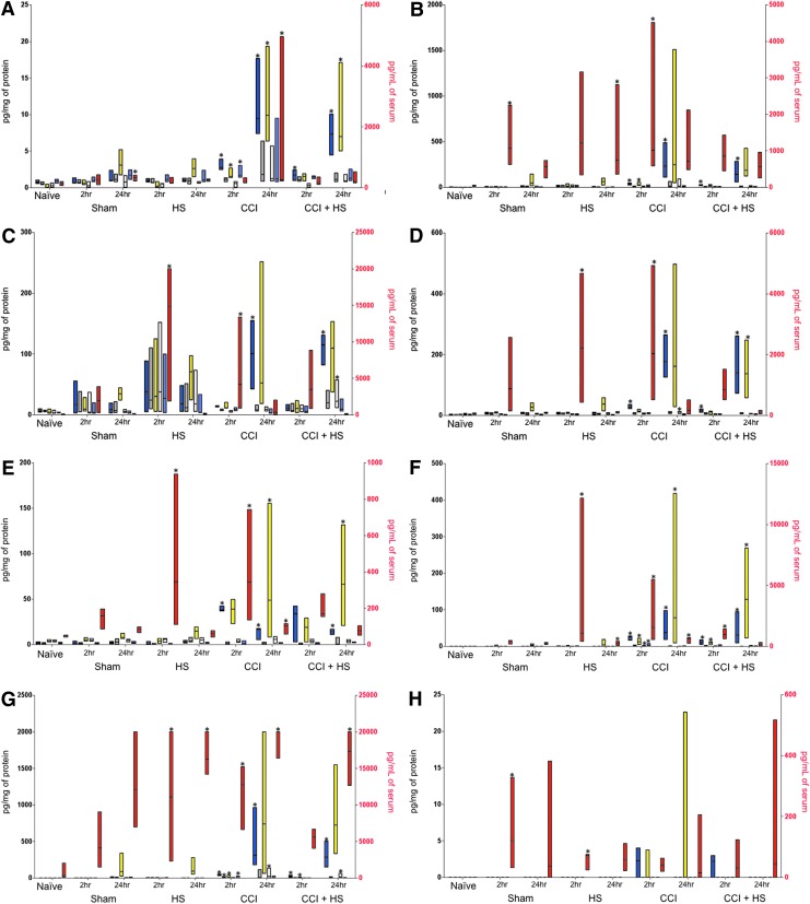 Secondary insults, such as hemorrhagic shock (HS), worsen outcome from traumatic brain injury (TBI). Both TBI and HS modulate levels of inflammatory mediators. We evaluated the addition of HS on the inflammatory response to TBI. Adult male C57BL6J mice were randomized into five groups (n=4 [naïve] or 8/group): naïve; sham; TBI (through mild-to-moderate controlled cortical impact [CCI] at 5 m/sec, 1-mm depth), HS; and CCI+HS. All non-naïve mice underwent identical monitoring and anesthesia. HS and CCI+HS underwent a 35-min period of pressure-controlled hemorrhage (target mean arterial pressure, 25-27 mm Hg) and a 90-min resuscitation with lactated Ringer's injection and autologous blood transfusion. Mice were sacrificed at 2 or 24 h after injury. Levels of 13 cytokines, six chemokines, and three growth factors were measured in serum and in five brain tissue regions. Serum levels of several proinflammatory mediators (eotaxin, interferon-inducible protein 10 [IP-10], keratinocyte chemoattractant [KC], monocyte chemoattractant protein 1 [MCP-1], macrophage inflammatory protein 1alpha [MIP-1α], interleukin [IL]-5, IL-6, tumor necrosis factor alpha, and granulocyte colony-stimulating factor [G-CSF]) were increased after CCI alone. Serum levels of fewer proinflammatory mediators (IL-5, IL-6, regulated upon activation, normal T-cell expressed, and secreted, and G-CSF) were increased after CCI+HS. Serum level of anti-inflammatory IL-10 was significantly increased after CCI+HS versus CCI alone. Brain tissue levels of eotaxin, IP-10, KC, MCP-1, MIP-1α, IL-6, and G-CSF were increased after both CCI and CCI+HS. There were no significant differences between levels after CCI alone and CCI+HS in any mediator. Addition of HS to experimental TBI led to a shift toward an anti-inflammatory serum profile--specifically, a marked increase in IL-10 levels. The brain cytokine and chemokine profile after TBI was minimally affected by the addition of HS.
