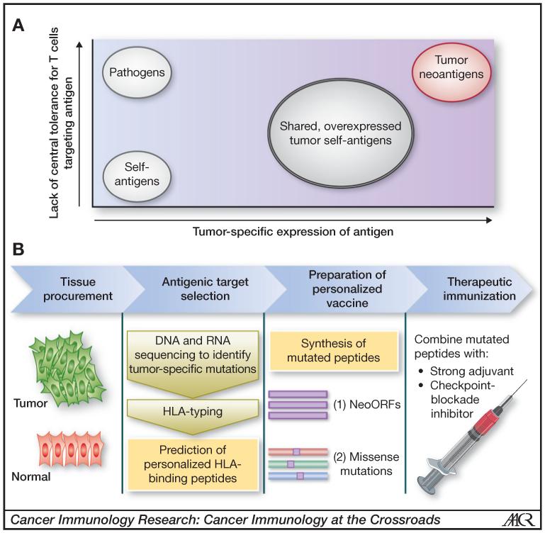 Despite years of preclinical efforts and hundreds of clinical studies, therapeutic cancer vaccines with the routine ability to limit or eliminate tumor growth in humans have been elusive. With advances in genome sequencing, it is now possible to identify a new class of tumor-specific antigens derived from mutated proteins that are present only in the tumor. These "neoantigens" should provide highly specific targets for antitumor immunity. Although many challenges remain in producing and testing neoantigen-based vaccines customized for each patient, a neoantigen vaccine offers a promising new approach to induce highly focused antitumor T cells aimed at eradicating cancer cells.