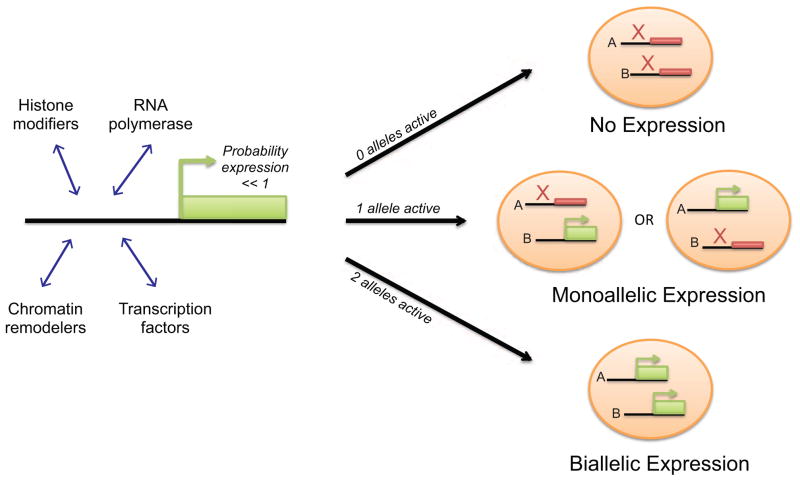 Monoallelic gene expression is a remarkable process in which transcription occurs from only one of two homologous alleles in a diploid cell. Interestingly, between 0.5% and 15% of autosomal genes exhibit random monoallelic gene expression, in which different cells express only one allele independently of the underlying genomic sequence, in a cell type-specific manner. Recently, genome-wide studies have increased our understanding of the cell type-specific incidence of random monoallelic gene expression, and how the imbalance in allelic expression is distinguished within the cell and potentially maintained across cell generations. Monoallelic gene expression is likely generated through stochastic independent regulation of the two alleles upon differentiation, and has varied implications for the cell and organism, in particular with respect to disease.