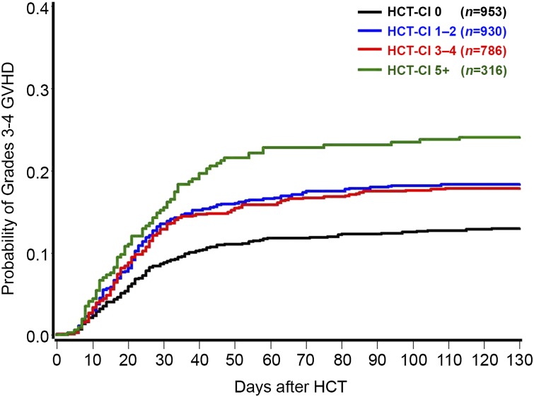 Whether the hematopoietic cell transplantation comorbidity index (HCT-CI) can provide prognostic information about development of acute graft-versus-host disease (GVHD) and subsequent mortality is unknown. Five institutions contributed information on 2985 patients given human leukocyte antigen-matched grafts to address this question. Proportional hazards models were used to estimate the hazards of acute GVHD and post-GVHD mortality after adjustment for known risk variables. Higher HCT-CI scores predicted increased risk of grades 3 to 4 acute GVHD (P < .0001 and c-statistic of 0.64), and tests of interaction suggested that this association was consistent among different conditioning intensities, donor types, and stem cell sources. Probabilities of grades 3 to 4 GVHD were 13%, 18%, and 24% for HCT-CI risk groups of 0, 1 to 4, and ≥5. The HCT-CI was statistically significantly associated with mortality rates following diagnosis of grade 2 (hazard ratio [HR] = 1.24; P < .0001) or grades 3 to 4 acute GVHD (HR = 1.19; P < .0001). Patients with HCT-CI scores of ≥3 who developed grades 3 to 4 acute GVHD had a 2.63-fold higher risk of mortality than those with scores of 0 to 2 and did not develop acute GVHD. Thus, pretransplant comorbidities are associated with the development and severity of acute GVHD and with post-GVHD mortality. The HCT-CI could be useful in designing trials for GVHD prevention and could inform expectations for GVHD treatment trials.