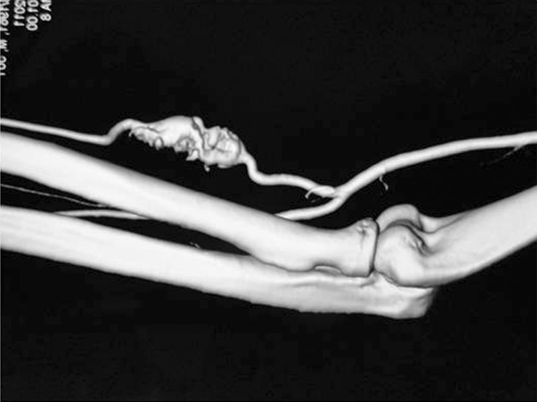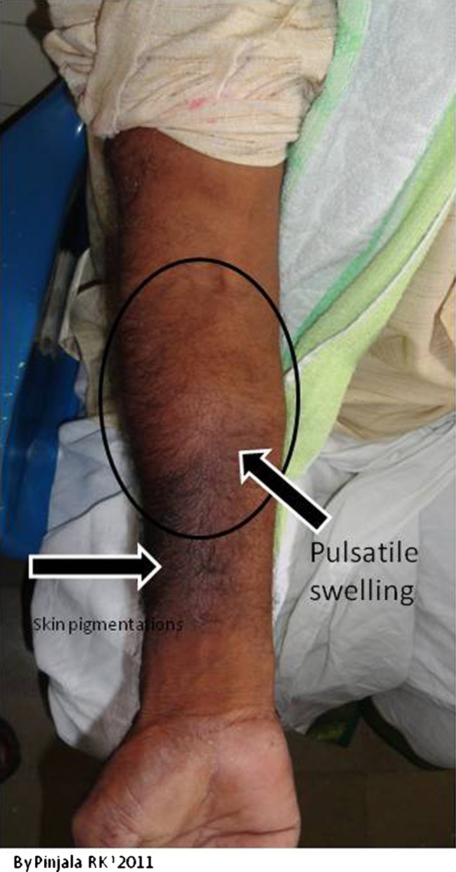 Tumour like vascular lesions are rare. Here we report a rare case of tumor like vascular lesion from the radial artery. A pulsatile swelling in the forearm is usually diagnosed as a case of Aneurysm, AV fistula or highly vascular tumor. A middle aged man came to us with a painless pulsatile swelling on the lateral aspect of proximal right forearm. The ultrasound scan reported it as case of vascular tumour. Angiogram showed abnormal vascular channels, connected to the aneurysmal dialation of the proximal radial artery. Histopthological examination confirmed it as Masson's hemangioma after excision. This is a benign condition and complete excision is curative.