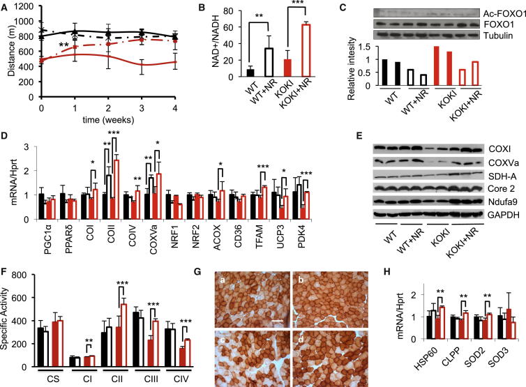 Mitochondrial disorders are highly heterogeneous conditions characterized by defects of the mitochondrial respiratory chain. Pharmacological activation of mitochondrial biogenesis has been proposed as an effective means to correct the biochemical defects and ameliorate the clinical phenotype in these severely disabling, often fatal, disorders. Pathways related to mitochondrial biogenesis are targets of Sirtuin1, a NAD(+)-dependent protein deacetylase. As NAD(+) boosts the activity of Sirtuin1 and other sirtuins, intracellular levels of NAD(+) play a key role in the homeostatic control of mitochondrial function by the metabolic status of the cell. We show here that supplementation with nicotinamide riboside, a natural NAD(+) precursor, or reduction of NAD(+) consumption by inhibiting the poly(ADP-ribose) polymerases, leads to marked improvement of the respiratory chain defect and exercise intolerance of the Sco2 knockout/knockin mouse, a mitochondrial disease model characterized by impaired cytochrome c oxidase biogenesis. This strategy is potentially translatable into therapy of mitochondrial disorders in humans.