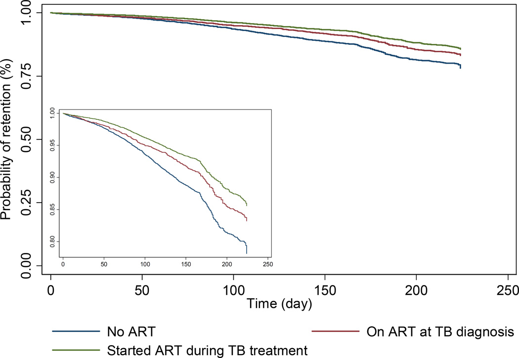 Conclusion: This study showed a relatively poor uptake of ART among severely immune-compromised TB patients. Patients with CD4 counts <350 cells per cubic millimeter were shown to clearly benefit from ART during TB treatment, and ART initiation should be prioritized for this category of patients.