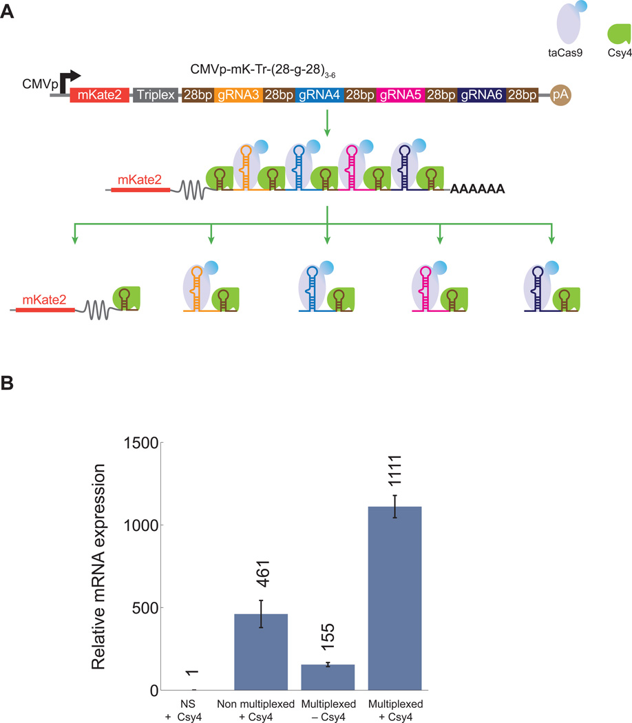 RNA-based regulation and CRISPR/Cas transcription factors (CRISPR-TFs) have the potential to be integrated for the tunable modulation of gene networks. A major limitation of this methodology is that guide RNAs (gRNAs) for CRISPR-TFs can only be expressed from RNA polymerase III promoters in human cells, limiting their use for conditional gene regulation. We present new strategies that enable expression of functional gRNAs from RNA polymerase II promoters and multiplexed production of proteins and gRNAs from a single transcript in human cells. We use multiple RNA regulatory strategies, including RNA-triple-helix structures, introns, microRNAs, and ribozymes, with Cas9-based CRISPR-TFs and Cas6/Csy4-based RNA processing. Using these tools, we efficiently modulate endogenous promoters and implement tunable synthetic circuits, including multistage cascades and RNA-dependent networks that can be rewired with Csy4 to achieve complex behaviors. This toolkit can be used for programming scalable gene circuits and perturbing endogenous networks for biology, therapeutic, and synthetic biology applications.