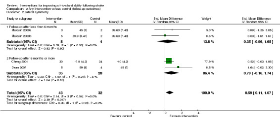 Main results: Thirteen studies (603 participants) met the inclusion criteria for this review, and data from 11 of these studies were included within meta-analyses. Twelve of the 13 included studies investigated rehabilitation interventions; one (nine participants) investigated the effect of altered starting posture for sit-to-stand. We judged only four studies to be at low risk of bias for all methodological parameters assessed. The majority of randomised controlled trials included participants who were already able to sit-to-stand or walk independently.Only one study (48 participants), which we judged to be at high risk of bias, reported our primary outcome of interest, ability to sit-to-stand independently, and found that training increased the odds of achieving independent sit-to-stand compared with control (odds ratio (OR) 4.86, 95% confidence interval (CI) 1.43 to 16.50, very low quality evidence).Interventions or training for sit-to-stand improved the time taken to sit-to-stand and the lateral symmetry (weight distribution between the legs) during sit-to-stand (standardised mean difference (SMD) -0.34; 95% CI -0.62 to -0.06, seven studies, 335 participants; and SMD 0.85; 95% CI 0.38 to 1.33, five studies, 105 participants respectively, both moderate quality evidence). These improvements are maintained at long-term follow-up.Few trials assessing the effect of sit-to-stand training on peak vertical ground reaction force (one study, 54 participants) and functional ability (two studies, 196 participants) were identified, providing very low and low quality evidence respectively.The effect of sit-to-stand training on number of falls was imprecise, demonstrating no benefit or harm (OR 0.75, 95% CI 0.46 to 1.22, five studies, 319 participants, low quality evidence). We judged the majority of studies that assessed falls to be at high risk of bias.