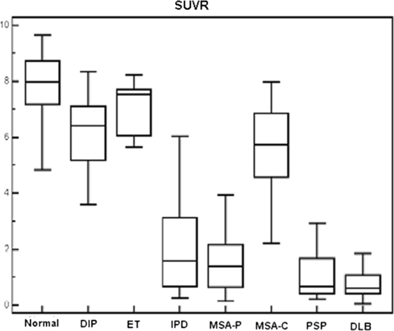 Results: Striatal DAT binding was normal in normal, ET, DIP, and MSA-C groups, but abnormal in PD, MSA-P, PSP, and DLB groups. No difference was found in regional uptake on early phase images among normal DAT binding groups, except in the MSA-C group. Abnormal DAT binding groups showed different regional uptake pattern on early phase images compared with PD in SPM analysis (FDR < 0.05). When discriminating APD from PD, visual interpretation of the early phase image showed high diagnostic sensitivity and specificity (75.4 % and 100 %, respectively). Regarding the ability to distinguish specific APD, sensitivities were 81 % for MSA-P, 77 % for MSA-C, 23 % for PSP, and 54.5 % for DLB.