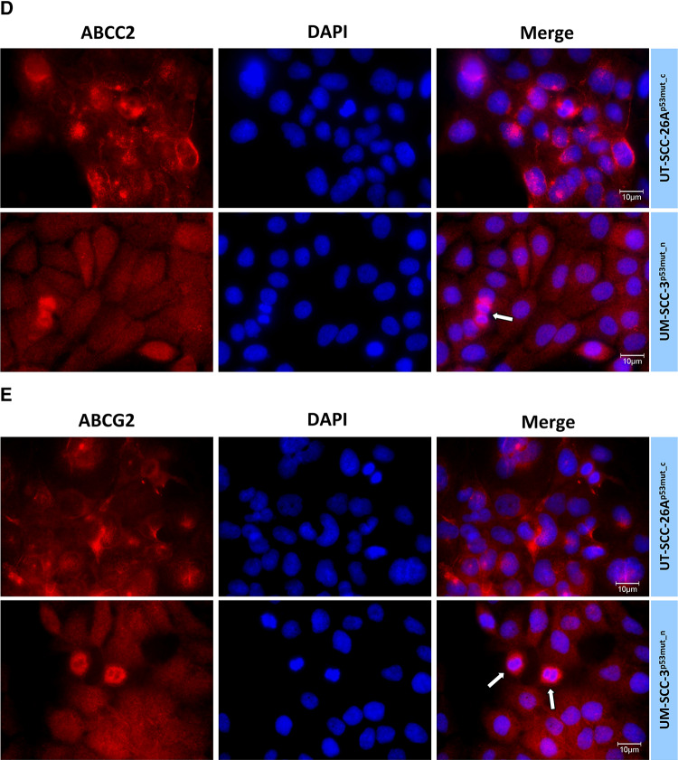 Results: Upregulation of ABCC2 and ABCG2 transporters was observed in CDDP-resistant p53(mut_c) HNSCC cells. Furthermore, p53(mut_c) cells exhibited a pronounced side population that could be suppressed by RNAi knockdown of ABCG2 as well as treatment with the ATP-binding-cassette transporter inhibitors imatinib, MK571 and tariquidar. Metabolic activity and cellular GSH levels were higher in CDDP-resistant p53(mut_c) cells, consistent with a higher capacity to fend off cytotoxic oxidative effects such as those caused by CDDP treatment. Finally, ABCC2/G2 inhibition of HNSCC cells with MK571 markedly enhanced CDDP sensitivity of HNSCC cells.