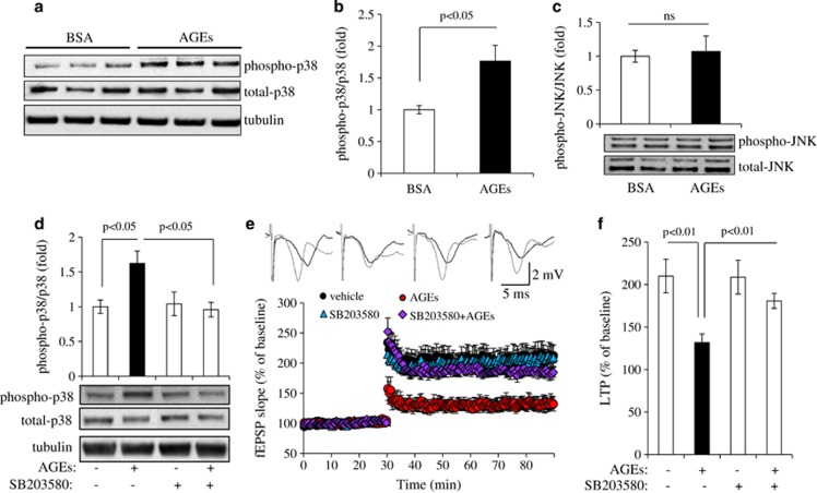 Synaptic dysfunction and degeneration is an early pathological feature of aging and age-related diseases, including Alzheimer's disease (AD). Aging is associated with increased generation and deposition of advanced glycation endproducts (AGEs), resulting from nonenzymatic glycation (or oxidation) proteins and lipids. AGE formation is accelerated in diabetes and AD-affected brain, contributing to cellular perturbation. The extent of AGEs' involvement, if at all, in alterations in synaptic structure and function is currently unknown. Here we analyze the contribution of neuronal receptor of AGEs (RAGE) signaling to AGE-mediated synaptic injury using novel transgenic neuronal RAGE knockout mice specifically targeted to the forebrain and transgenic mice expressing neuronal dominant-negative RAGE (DN-RAGE). Addition of AGEs to brain slices impaired hippocampal long-term potentiation (LTP). Similarly, treatment of hippocampal neurons with AGEs significantly decreases synaptic density. Such detrimental effects are largely reversed by genetic RAGE depletion. Notably, brain slices from mice with neuronal RAGE deficiency or DN-RAGE are resistant to AGE-induced LTP deficit. Further, RAGE deficiency or DN-RAGE blocks AGE-induced activation of p38 signaling. Taken together, these data show that neuronal RAGE functions as a signal transducer for AGE-induced synaptic dysfunction, thereby providing new insights into a mechanism by which the AGEs-RAGE-dependent signaling cascade contributes to synaptic injury via the p38 MAP kinase signal transduction pathway. Thus, RAGE blockade may be a target for development of interventions aimed at preventing the progression of cognitive decline in aging and age-related neurodegenerative diseases.