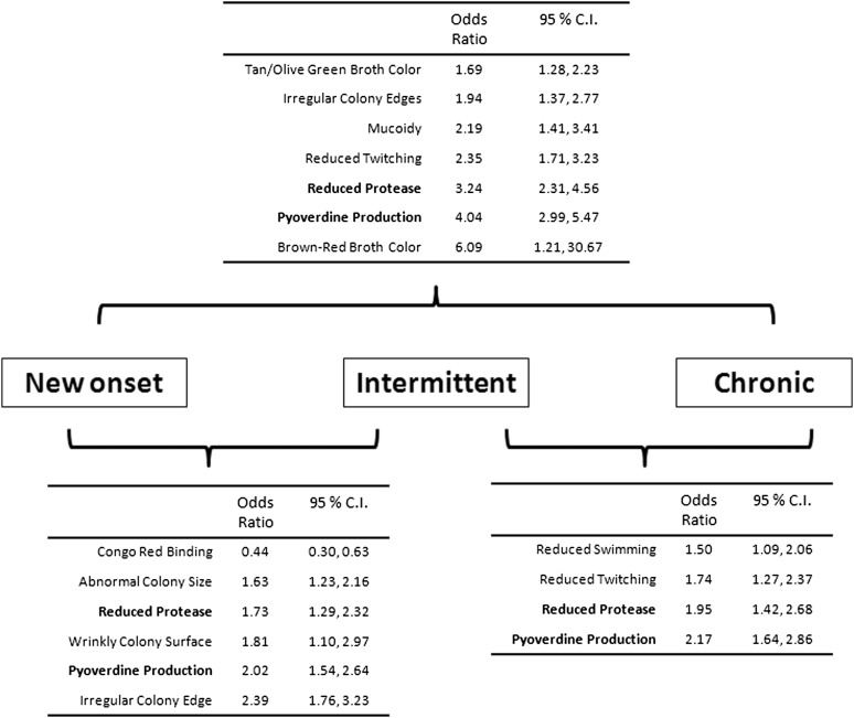 Measurements and main results: P. aeruginosa phenotypes present at the time of culture were associated with both stage of infection (new onset, intermittent, or chronic) and the primary clinical outcome, occurrence of a pulmonary exacerbation (PE) in the subsequent 2 years. Two in vitro P. aeruginosa phenotypes best distinguished infection stages: pyoverdine production (31% of new-onset cultures, 48% of intermittent, 69% of chronic) and reduced protease production (31%, 39%, and 65%, respectively). The best P. aeruginosa phenotypic predictors of subsequent occurrence of a PE were mucoidy (odds ratio, 1.75; 95% confidence interval, 1.19-2.57) and reduced twitching motility (odds ratio, 1.43; 95% confidence interval, 1.11-1.84).