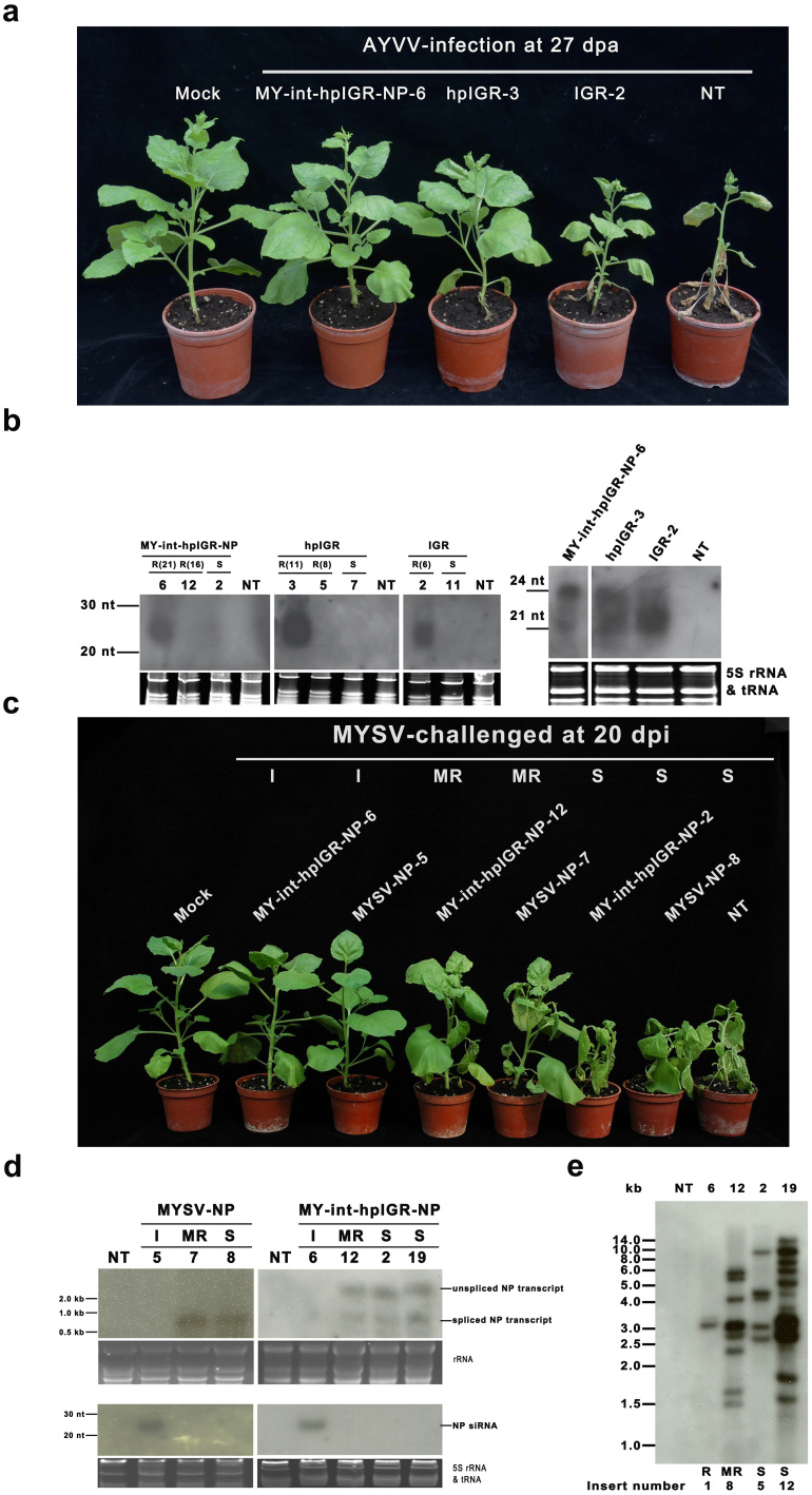 Global threats of ssDNA geminivirus and ss(-)RNA tospovirus on crops necessitate the development of transgenic resistance. Here, we constructed a two-T DNA vector carrying a hairpin of the intergenic region (IGR) of Ageratum yellow vein virus (AYVV), residing in an intron inserted in an untranslatable nucleocapsid protein (NP) fragment of Melon yellow spot virus (MYSV). Transgenic tobacco lines highly resistant to AYVV and MYSV were generated. Accumulation of 24-nt siRNA, higher methylation levels on the IGR promoters of the transgene, and suppression of IGR promoter activity of invading AYVV indicate that AYVV resistance is mediated by transcriptional gene silencing. Lack of NP transcript and accumulation of corresponding siRNAs indicate that MYSV resistance is mediated through post-transcriptional gene silencing. Marker-free progenies with concurrent resistance to both AYVV and MYSV, stably inherited as dominant nuclear traits, were obtained. Hence, we provide a novel way for concurrent control of noxious DNA and RNA viruses with less biosafety concerns.
