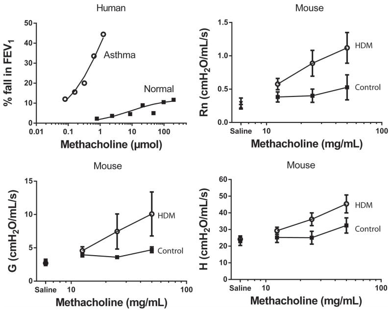 , 20 year old male, baseline FEV1 of 97% predicted) and a healthy, non-asthmatic subject (■, 27 year old male, baseline FEV1 of 92% predicted). Note that the asthmatic patient has a provocative dose causing a 20% fall in forced expiratory volume in one second (PD20FEV1) of 0.3μmol of methacholine whereas the non-asthmatic subject does not reach a 20% fall even at a dose > 500-fold higher. The response to methacholine in mice following either 15 instillations of control (PBS, ■) or house dust mite (HDM,