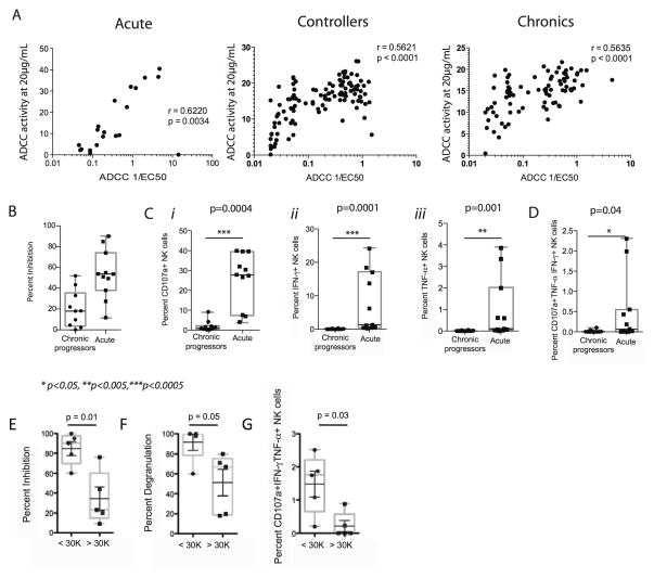 Fc-related antibody activities, such as antibody-dependent cellular cytotoxicity (ADCC), or more broadly, antibody-mediated cellular viral inhibition (ADCVI), play a role in curbing early SIV viral replication, are enriched in human long-term infected nonprogressors, and could potentially contribute to protection from infection. However, little is known about the mechanism by which such humoral immune responses are naturally induced following infection. Here, we focused on the early evolution of the functional antibody response, largely driven by the Fc portion of the antibody, in the context of the evolving binding and neutralizing antibody response, which is driven mainly by the antibody-binding fragment (Fab). We show that ADCVI/ADCC-inducing responses in humans are rapidly generated following acute HIV-1 infection, peak at approximately 6 months postinfection, but decay rapidly in the setting of persistent immune activation, as Fab-related activities persistently increase. Moreover, the loss of Fc activity occurred in synchrony with a loss of HIV-specific IgG3 responses. Our data strongly suggest that Fc- and Fab-related antibody functions are modulated in a distinct manner following acute HIV infection. Vaccination strategies intended to optimally induce both sets of antiviral antibody activities may, therefore, require a fine tuning of the inflammatory response.