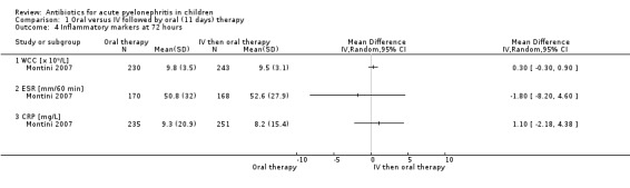 Main results: This updated review included 27 studies (4452 children). This update included evidence from three new studies, and following re-evaluation, a previously excluded study was included because it now met our inclusion criteria.Risk of bias was assessed as low for sequence generation (12 studies), allocation concealment (six studies), blinding of outcome assessors (17 studies), incomplete outcome reporting (19 studies) and selective outcome reporting (13 studies). No study was blinded for participants or investigators. The 27 included studies evaluated 12 different comparisons. No significant differences were found in duration of fever (2 studies, 808 children: MD 2.05 hours, 95% CI -0.84 to 4.94), persistent UTI at 72 hours after commencing therapy (2 studies, 542 children: RR 1.10, 95% CI 0.07 to 17.41) or persistent kidney damage at six to 12 months (4 studies, 943 children: RR 0.82, 95% CI 0.59 to 1.12) between oral antibiotic therapy (10 to 14 days) and intravenous (IV) therapy (3 days) followed by oral therapy (10 days). Similarly, no significant differences in persistent bacteriuria at the end of treatment (4 studies, 305 children: RR 0.78, 95% CI 0.24 to 2.55) or persistent kidney damage (4 studies, 726 children: RR 1.01, 95% CI 0.80 to 1.29) were found between IV therapy (three to four days) followed by oral therapy and IV therapy (seven to 14 days). No significant differences in efficacy were found between daily and thrice daily administration of aminoglycosides (1 study, 179 children, persistent clinical symptoms at three days: RR 1.98, 95% CI 0.37 to 10.53). Adverse events were mild and uncommon and rarely resulted in discontinuation of treatment.